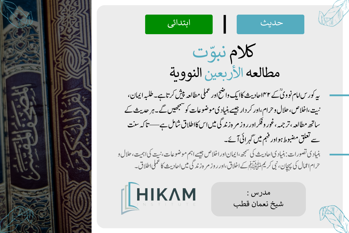 ان باتوں کو ذہن میں رکھتے ہوئے، ہمیں یہ اعلان کرتے ہوئے خوشی ہو رہی ہے کہ ہم نے سنت کو سمجھنے کے لیے ایک نیا کورس متعارف کرایا ہے۔ اس کورس میں ہم معزز اسلامی عالم امام نووی کی ایک نہایت معزز کتاب کا مطالعہ اور غور کریں گے—تین ماہ میں 42 احادیث پر توجہ مرکوز کی جائے گی۔