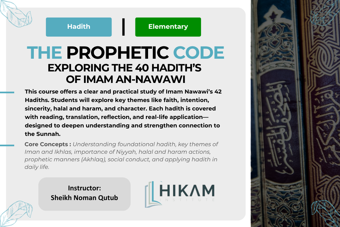 This three-month course is structured around the study of the 42 hadiths compiled by Imam Nawawi. Each week, we will cover approximately three to four hadiths, dedicating time to reading, translation, contextual understanding, and reflection. The curriculum includes discussions on key themes such as faith (iman), intention (niyyah), sincerity (ikhlas), lawful and unlawful acts (halal and haram), manners and ethics (akhlaq), and social conduct. Practical examples and brief commentary will be provided to help students relate the teachings to their daily lives. The course will be delivered in a manner accessible to students of all levels, aiming to foster not only knowledge but also love and reverence for the Sunnah.